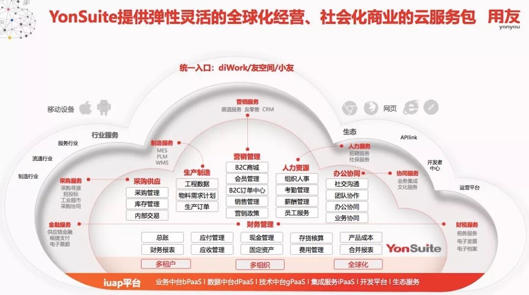 在企業(yè)服務(wù)領(lǐng)域奮斗了31年的用友,也沉淀出了完整的產(chǎn)品體系,諸如深入垂直行業(yè)的行業(yè)云,以及營(yíng)銷、采購(gòu)、協(xié)同、財(cái)務(wù)、人力等通用型的領(lǐng)域云等等。